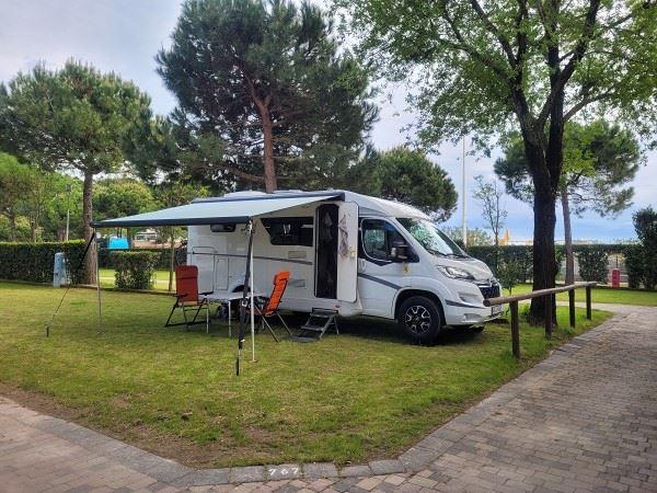 Trotz Online-Check-In dauerte die Anmeldung eine halbe Ewigkeit, anschließend wurden wir zu unserem Stellplatz A-Plus 767 gebracht, den wir uns schon vorab ausgesucht hatten. Hier im Villaggio sind wir tatsächlich immer im gleichen Bereich (wenn auch immer auf anderen Stellplätzen). Eine ruhige und entspannte Ecke mit großzügigen Flächen.
