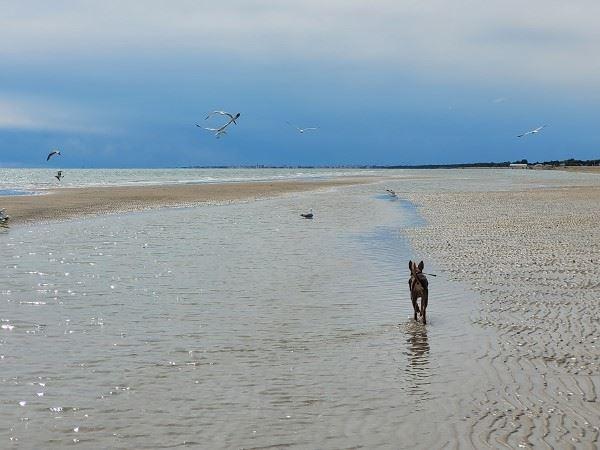 Das Wasser hatte sich ein Stück weit zurückgezogen (ja, auch hier gibt es so etwas wie Ebbe und Flut, wenn auch nicht so deutlich zu erkennen wie an der Nordsee), es entstanden kleine Siele und die Möwen holten sich die Würmer aus dem Sand. Unsere Hunde tobten sich so richtig aus und waren einfach nur happy.
