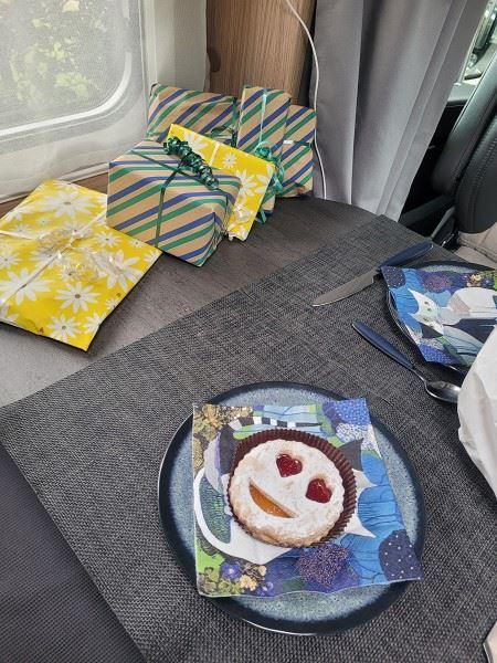 Ganz untypisch für Toni's Ehrentag, denn in den letzten Jahren feierten wir stets bei Sonnenschein. Dieses Mal musste der Geburtstagstisch im Innenbereich des Vans dekoriert werden. Beim Bäcker noch ein süßes Smiley-Gebäck mitgenommen, starteten wir gemütlich in den Tag.