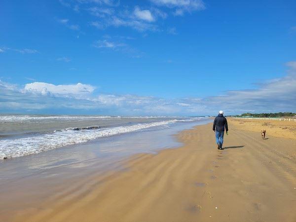 Nach frühstücken und Geschenke auspacken ging es zumindest im Trockenen, aber bei doch deutlich heftigerem Wind, auf eine lange Gassi-Runde entlang der Strandpromenade und durch Bibione hindurch. Mia's Mut von gestern war heute wie weggeblasen (wie 'passend'). Stellenweise stand ihr die Panik wieder ins Gesicht geschrieben. Obwohl heute nichts anders war. Schade. Wir hatten schon gehofft, dass sie ihre Angst vielleicht endgültig besiegt hätte. Aber so ist eben jeder Tag anders und jeder Tag eine Überraschung mit ihr. Wir wissen es ja.