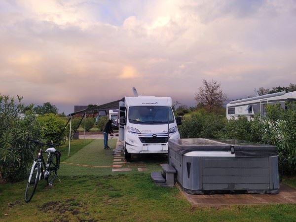 Die Stellplätze sind zwischen 100 und 150 qm groß und bieten je nach Kategorie sogar einen eigenen Whirlpool, einen Zugang zu einer großen Gemeinschaftswiese und Blick auf Buje bzw. in Richtung Sonnenuntergang. Und genau so einen Platz hatten wir. Nun gut – mit dem Sonnenuntergang würde es heute vermutlich eher schwierig werden. Aber den Whirlpool kann man im Zweifelsfalle auch bei Schlechtwetter nutzen. Wann hat man so etwas schon mal?