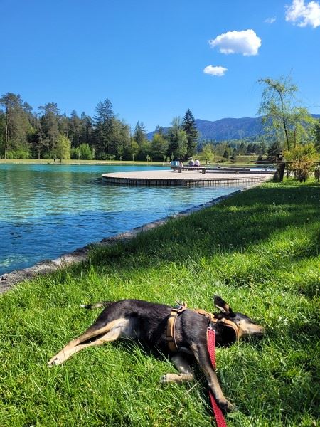Mia hatte keine Lust auf Gassi. Benita dafür umso mehr und so ging es mit ihr wieder auf Tour. Nicht, dass es ihr nicht eigentlich viel zu heiß gewesen wäre. Wir hatten heute knapp 28 Grad. Aber der Drang zu Schnüffeln war einfach doch zu groß. Wieder zurück, hatten es sich Anton und Mia bereits draußen am See gemütlich gemacht. Wir gesellten uns dazu und verbrachten den Nachmittag wieder mit viel Ruhe und Erholung.