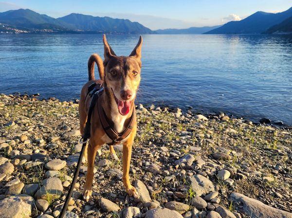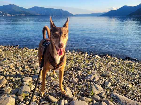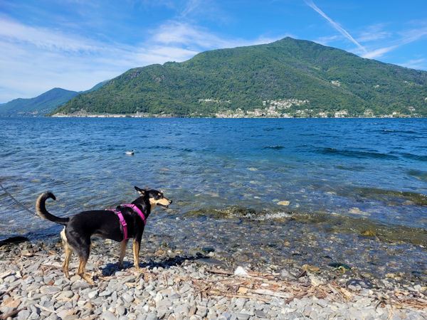 Jetzt erst einmal eine Gassirunde mit den Hunden. Wir spazierten durch das Tor zum See und standen nun direkt davor. Ciao, Lago Maggiore!