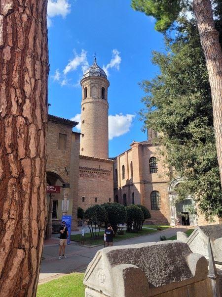 Auf der anderen Seite der Markthalle verließ ich das Gebäude wieder und stand nun auf der Piazza Andrea Costa, die von vielen bunten Gebäuden eingefasst wird. Entlang der Einkaufsstraße Via Camillo Benso Cavour erreichte ich schließlich über die Via Galla Placidia die Basilica di San Vitale. Schon allein das Eingangstor wirkt beeindruckend, dahinter erstreckt sich ein riesiges Areal an Kirchen, Türmen, Kapellen und einer Parkanlage.