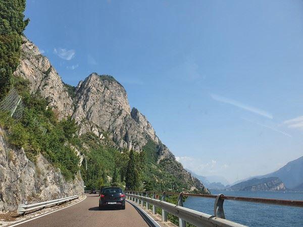 Weil uns das Navi auf dem Hinweg etwas eigenartig lotste, wählten wir heute eine andere Strecke, die aber durchaus reizvoll war. Wir fuhren wieder an der Westseite des Gardasees entlang, begleitet von herrlichen Ausblicken auf den See. Dabei fielen uns die zahlreichen Hotels auf, deren Parkplätze so dermaßen eng und begrenzt sind, dass wir uns ehrlich fragten, wie man hier entspannt urlauben kann? Die Fahrzeuge standen zum Teil querbeet. Wollte der letzte raus, mussten fünf andere umparken. Ne, das wäre ja absolut nichts für mich. Stress vorprogrammiert.