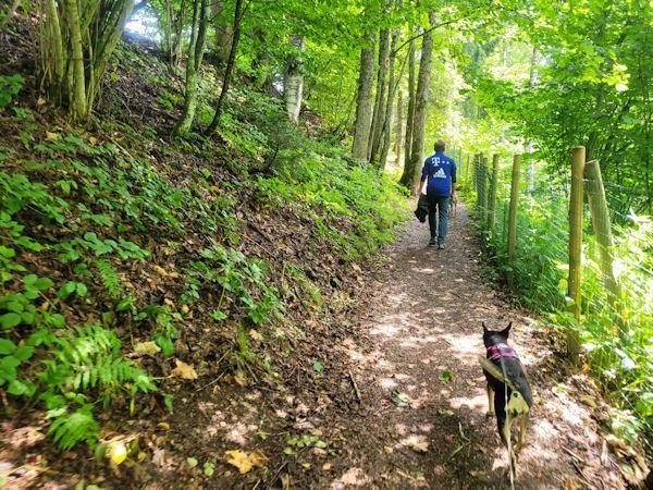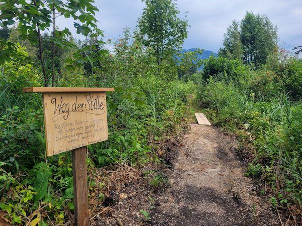 Während des Wegs erreichten wir eine Abzweigung zum ‘Weg der Stille’. Für Radfahrer, Hunde und Reiter strengstens verboten. Ein kleiner Pfad führte in ein Dickicht hinein. Ich lief nur ein paar Meter und drehte wieder um. Schließlich waren wir mit den Hunden da und so ganz allein war mir das doch etwas zu spooky.